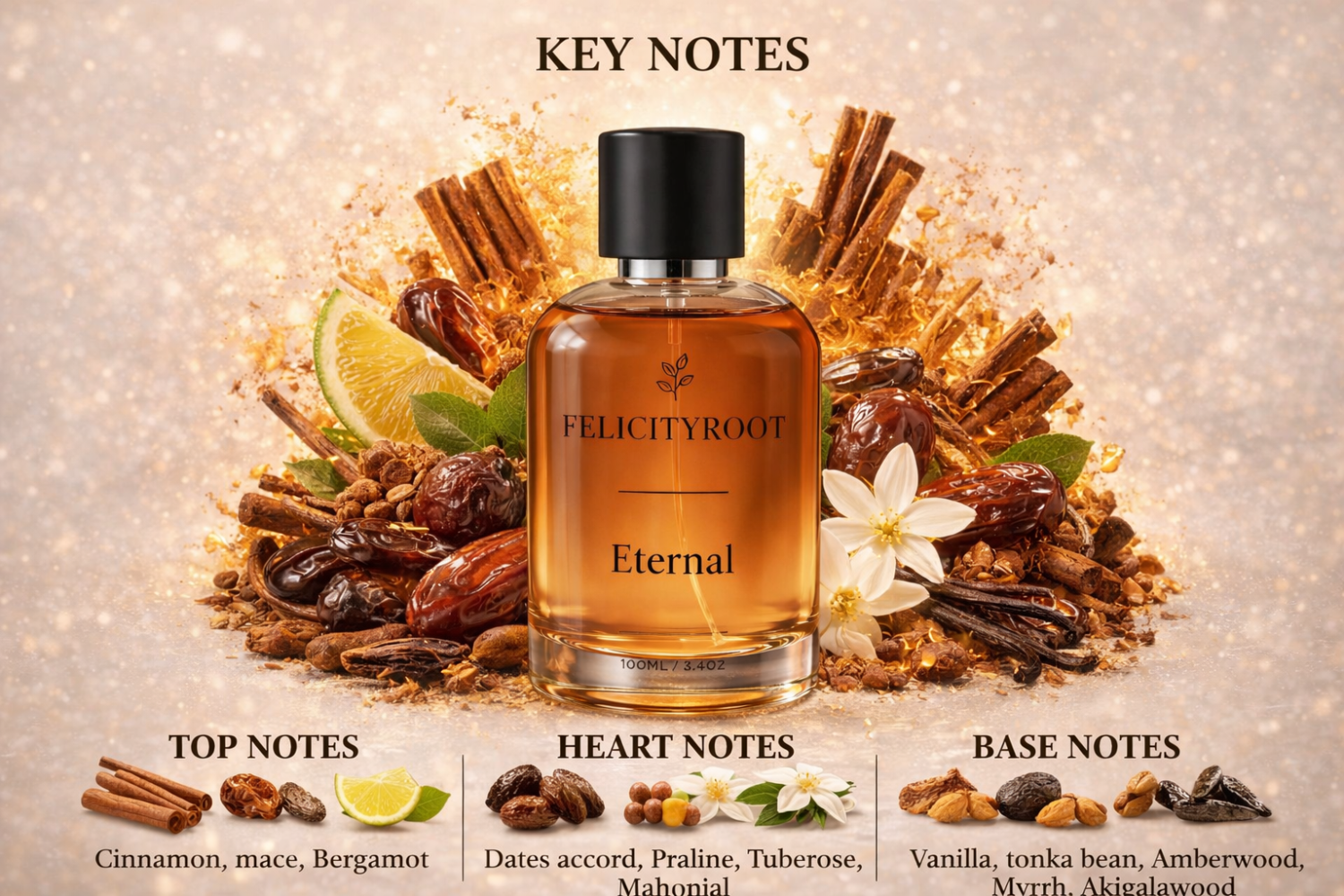 Cinnamon and Mace mingle with bright Bergamot, opening the fragrance with a warm, vibrant energy. At its heart, the sweet richness of Dates and Praline flows seamlessly into the creamy floral elegance of Tuberose and the soft, velvety depth of Mahonial. The base wraps everything in sensual layers of Vanilla, Tonka Bean, Amberwood, Myrrh, and smoky Akigalawood, leaving a luxurious trail that is both indulgent and profoundly sophisticated — a masterful dance of spice, sweetness, and deep woody warmth.
