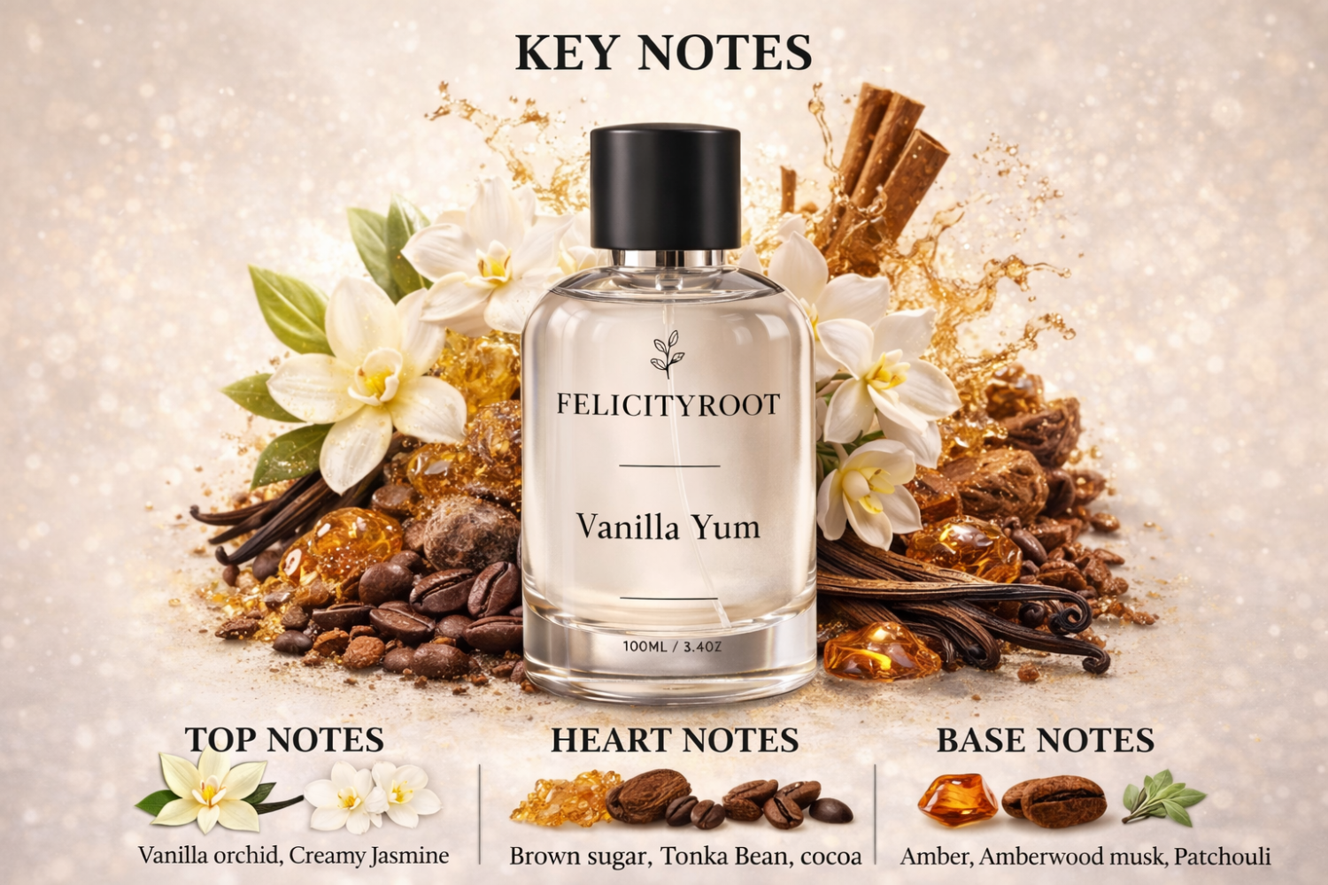 Vanilla Orchid and creamy Jasmine open the fragrance with a soft, radiant sweetness that immediately captivates the senses. At its heart, the warm richness of Brown Sugar and Tonka Bean blends seamlessly with the decadent depth of Cocoa, creating a sumptuous, gourmand embrace. The base settles into a lingering veil of golden Amber, rich Amberwood Musk, and earthy Patchouli, leaving an irresistibly elegant trail — a masterful harmony of creamy florals, sweet indulgence, and deep, sensual warmth.